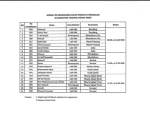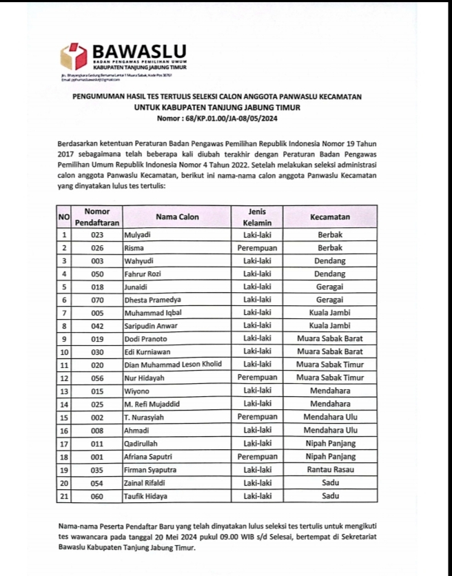 Sebanyak 21 orang yang Telah di nyata kan lulus Menjalan kan ujian Computer Assisted Test (CAT), Maka di lanjut kan Tes Wawan cara yang di jadwal kan pada Tanggal 20 Mei 2024 yang Bertempat di Aula Sekretariat Gedung Kantor Bawaslu Kabupaten tanjabtimur, jalan Bhayangkara Kompleks Perkantoran Bukit Benderang Talang Babat.