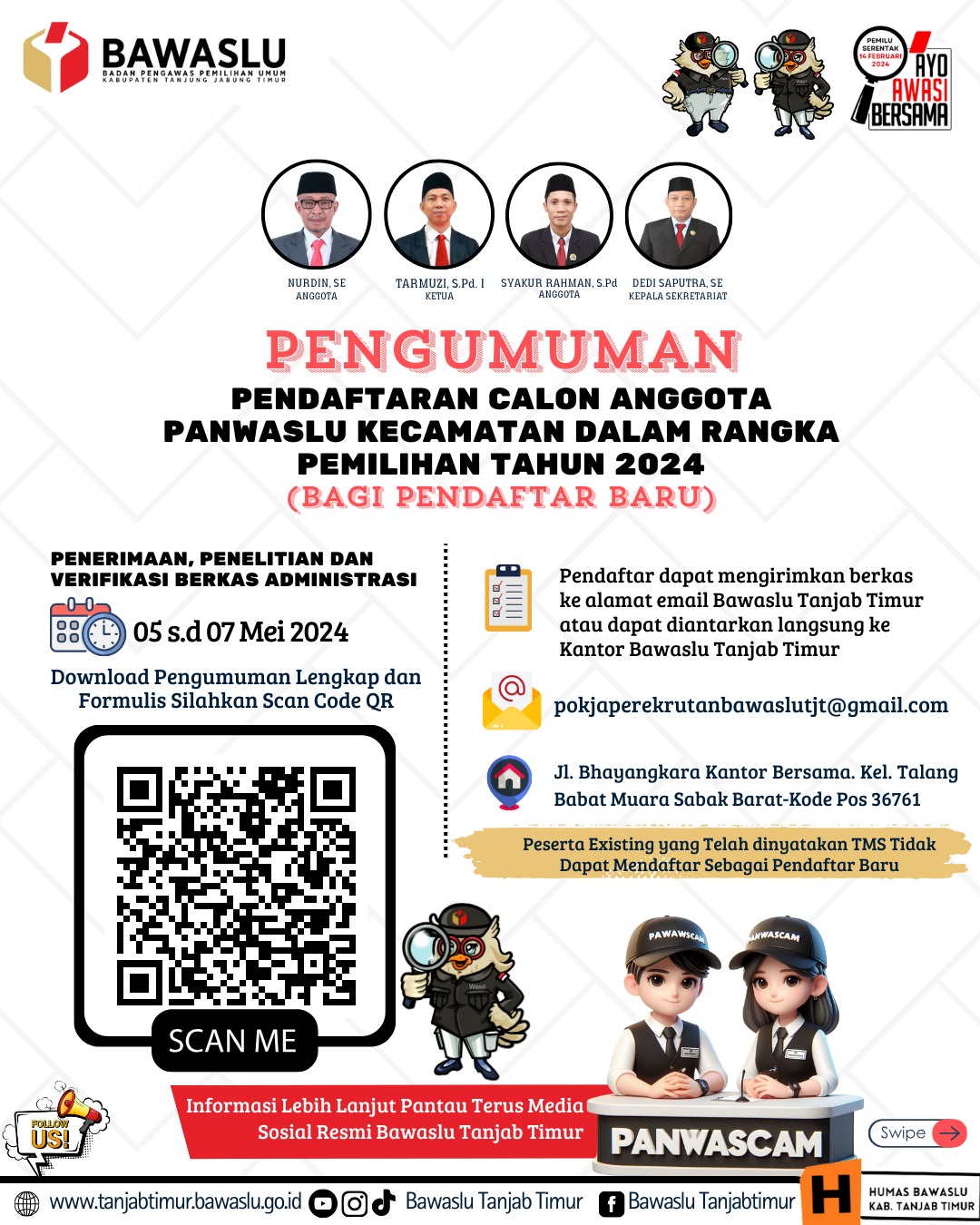Menindak lanjut keputusan Bawaslu Republik indonesia yang di maksud, Badan Pengawasan Pemilihan umum Tanjabtimur Membuka Ruang Kepada warga Negara RI yang memenuhi Syarat untuk Menjadi calon Panwaslu kecamatan, Melalui kelompok kerja pembentukan Panwaslu di 11 kecamatan yang tersebar di Kabupaten Tanjabtim, Sesuai Kebutuhan Kuota diantara nya.