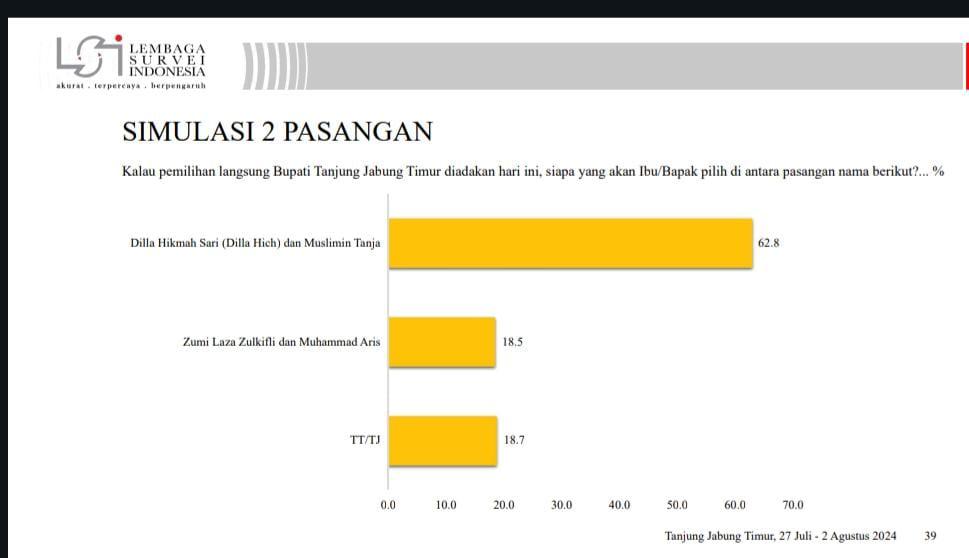 Peta kekuatan itu terpotret jelas dari sejumlah survey elektoral yang dilakukan berbagai lembaga survey kredibel. Terakhir survey Lembaga Survey Indonesia (LSI) yang memposisikan Dilla – MT di angka 62,8 persen jauh meninggalkan lawannya Zumi Laza – Muhammad Aries yang hanya 18,5 persen. (red)