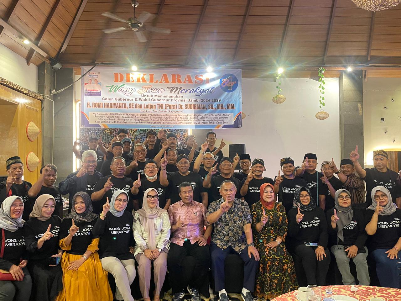 Dalam dukungan yang dihelat di salah satu hotel di Jambi dihadiri 30 an paguyuban yang disebut dengan Wong Jowo Merakyat.