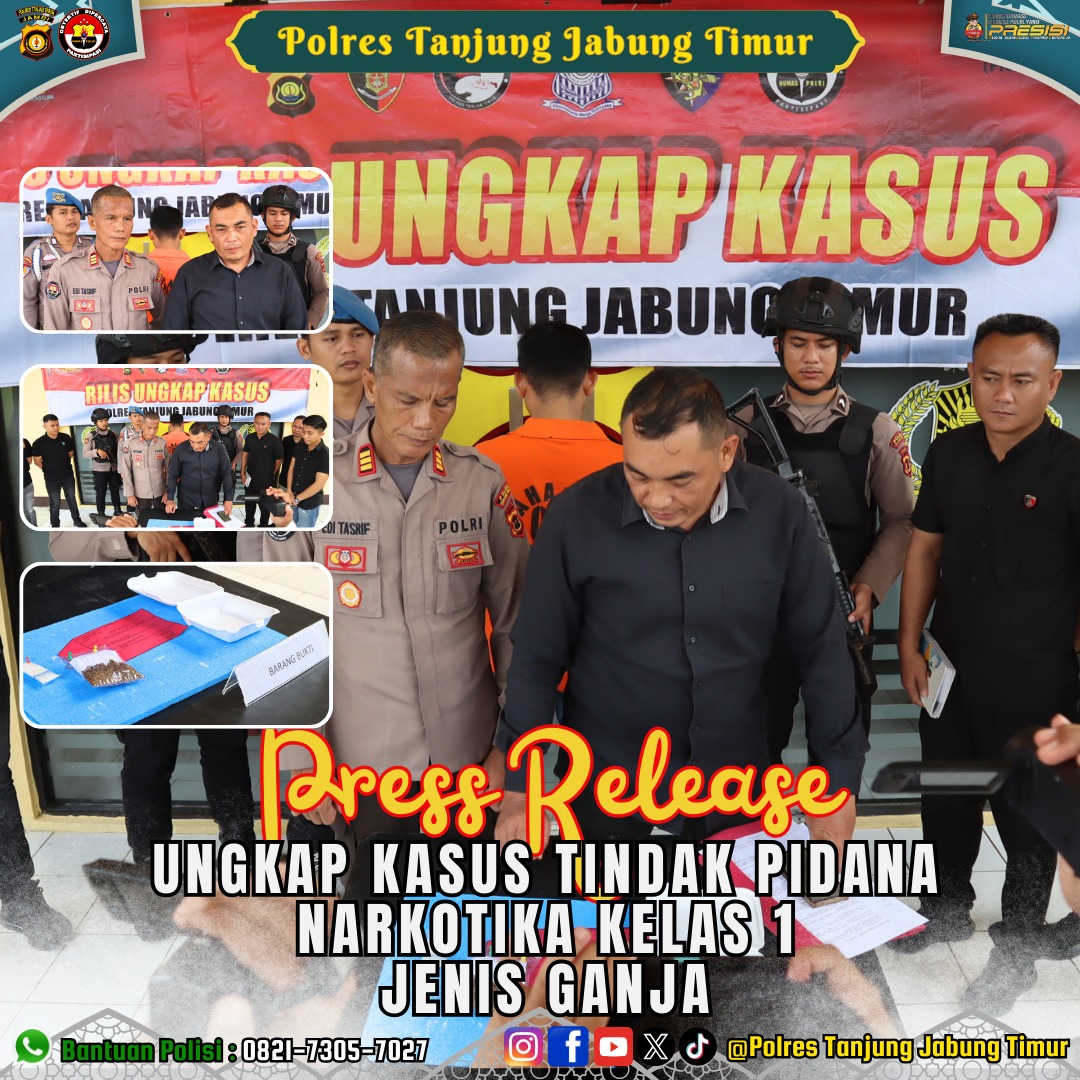 Kasat Res Narkoba Polres Tanjab Timur Akp Charles Motara Sitorus yang didampingi Kasi Humas Polres Tanjab Timur Akp Edi Tasrif, S.E dalam giat Konferensi Pers menjelaskan “Dari hasil operasional dilapangan, Rabu, 12/03/2025 pihaknya telah berhasil mengungkap kasus narkotika golongan 1 jenis ganja dan mengamankan satu orang tersangka An. Gendta Restu Kirana Als Genta Bin Herman, umur 23 Tahun tepatnya di Jalan melati RT.003/002 Kelurahan Muara sabak ilir Kec. Muara sabak timur Kab. Tanjab timur. Selasa, (18/03/2025).